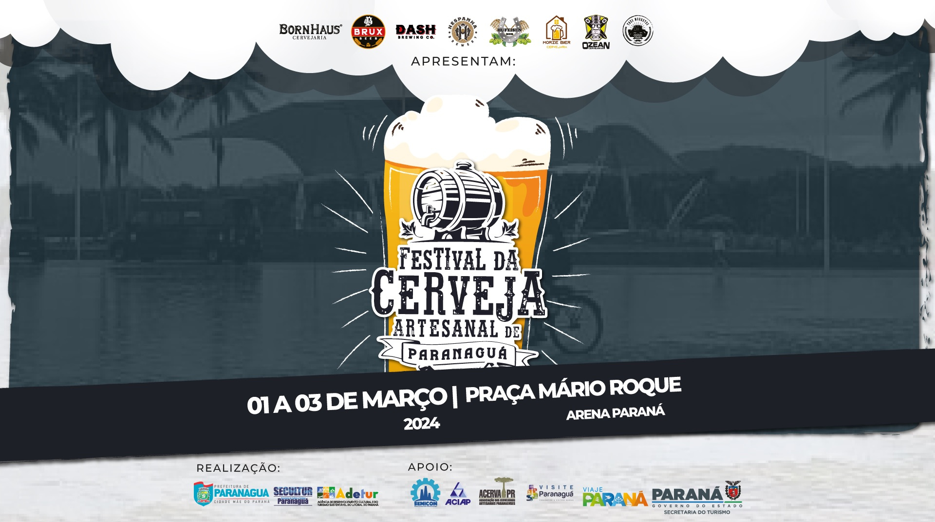 Oito cervejarias participam do Festival da Cerveja Artesanal de Paranaguá. O evento, realizado pela Prefeitura de Paranaguá, por meio da Secretaria Municipal de Cultura e Turismo e pela Adetur, acontecerá de 01 a 03 de março na Praça Mário Roque.