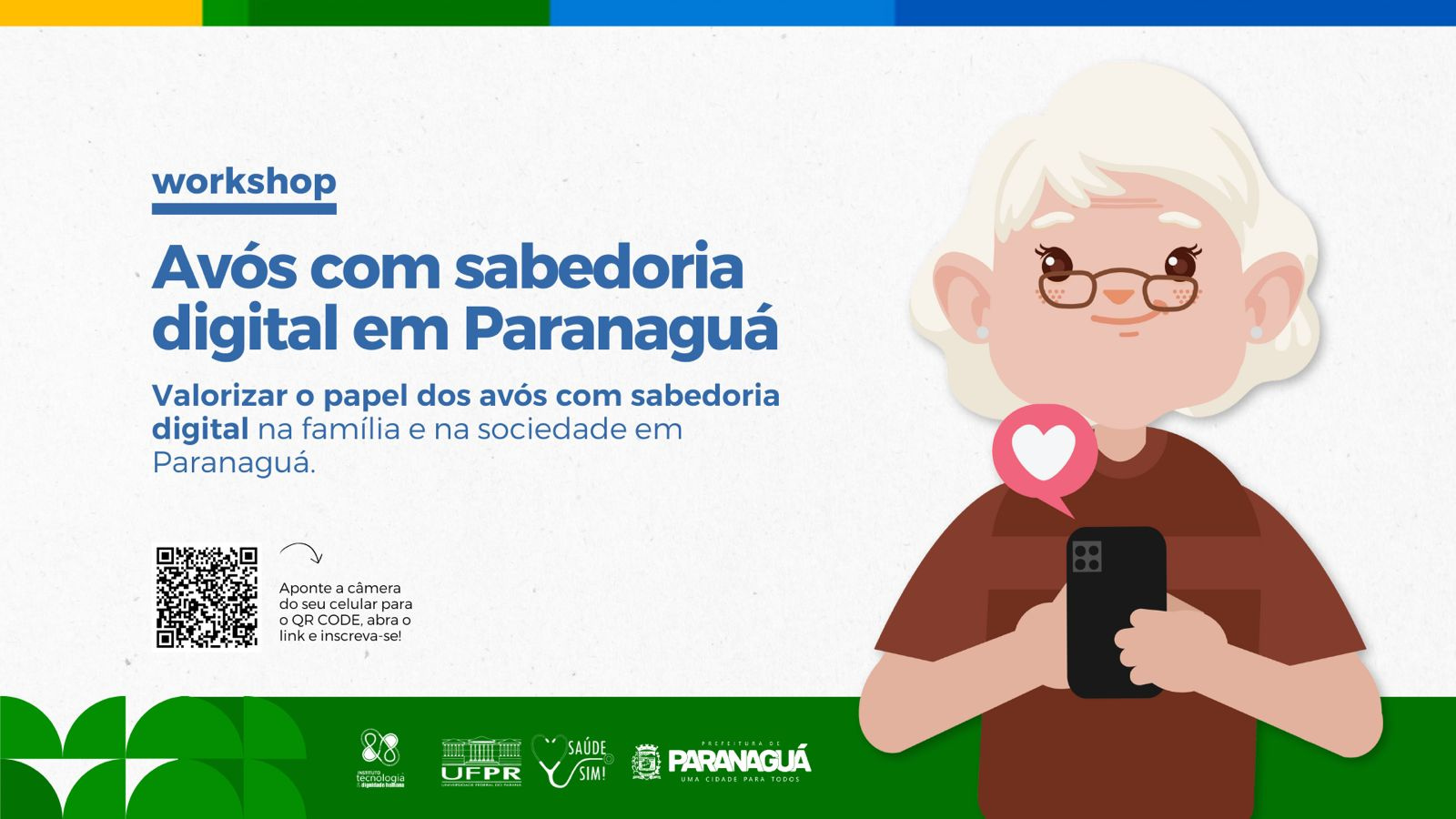 A Prefeitura de Paranaguá, em parceria com o Instituto Tecnologia e Dignidade Humana, realiza na próxima quarta-feira (1º), o workshop “Avós com Sabedoria Digital”, que busca valorizar e incentivar a inclusão digital da terceira idade. A atividade acontece das 15h às 17h, no Sesc Paranaguá, localizado na Rua Domingos Peneda, 947, bairro Estradinha.