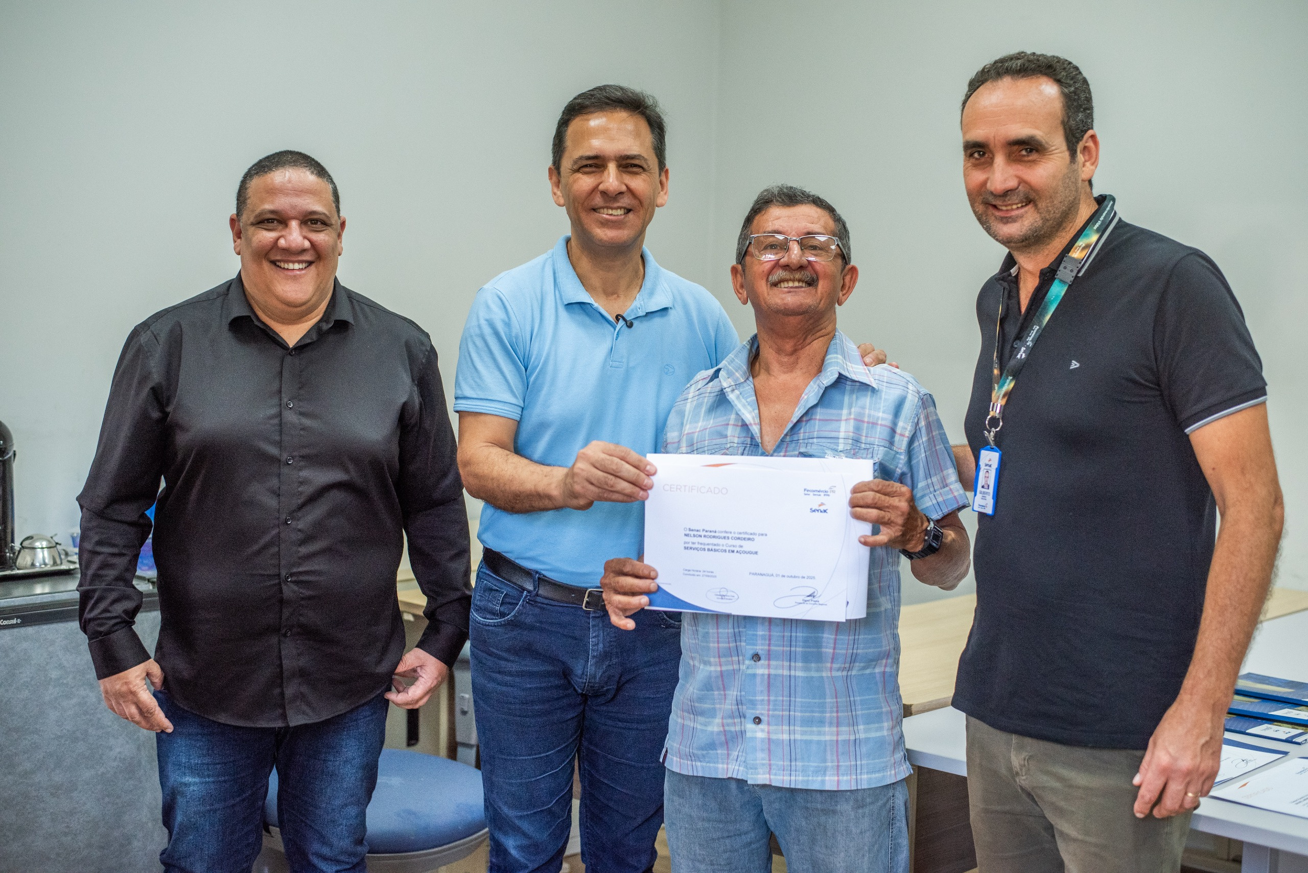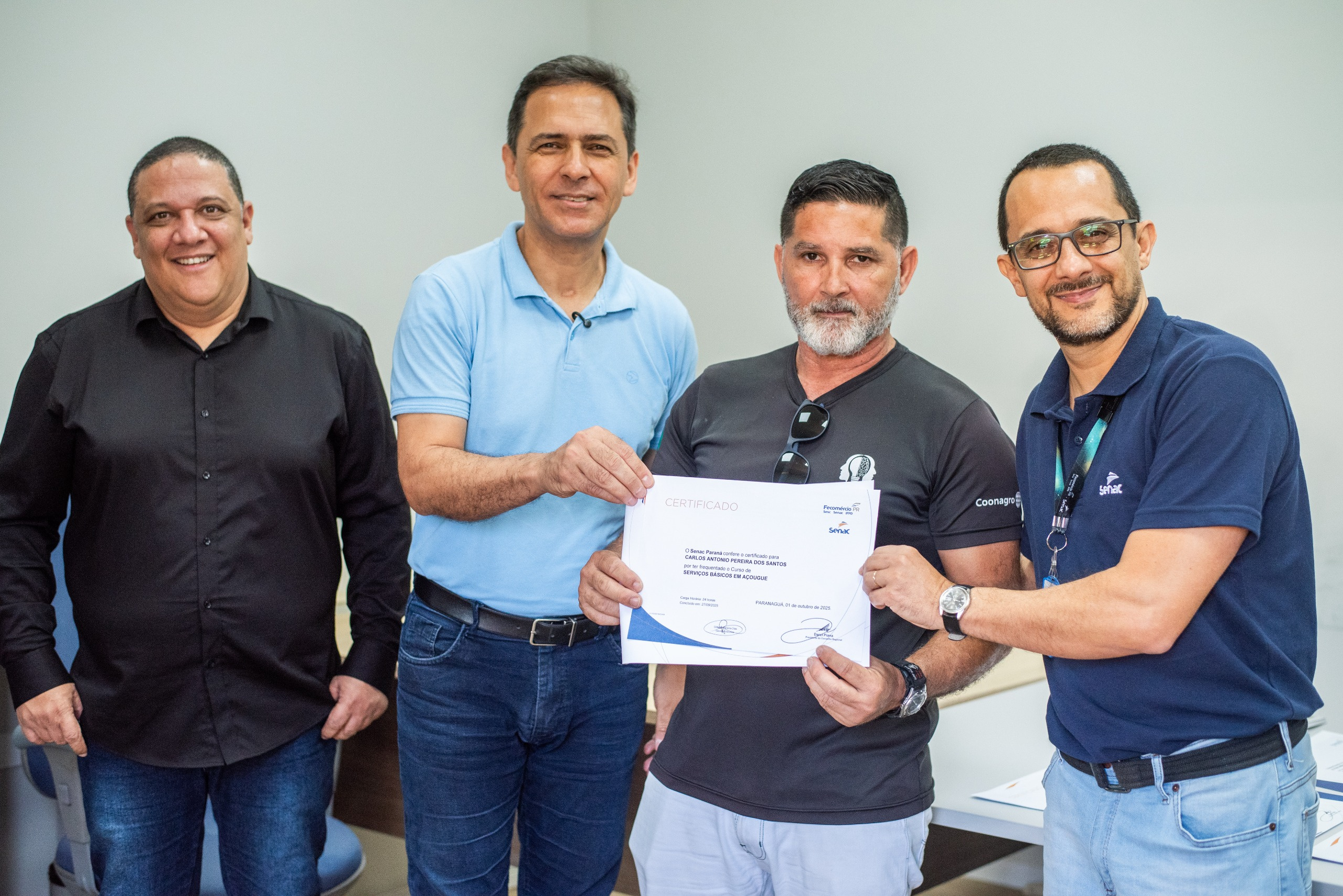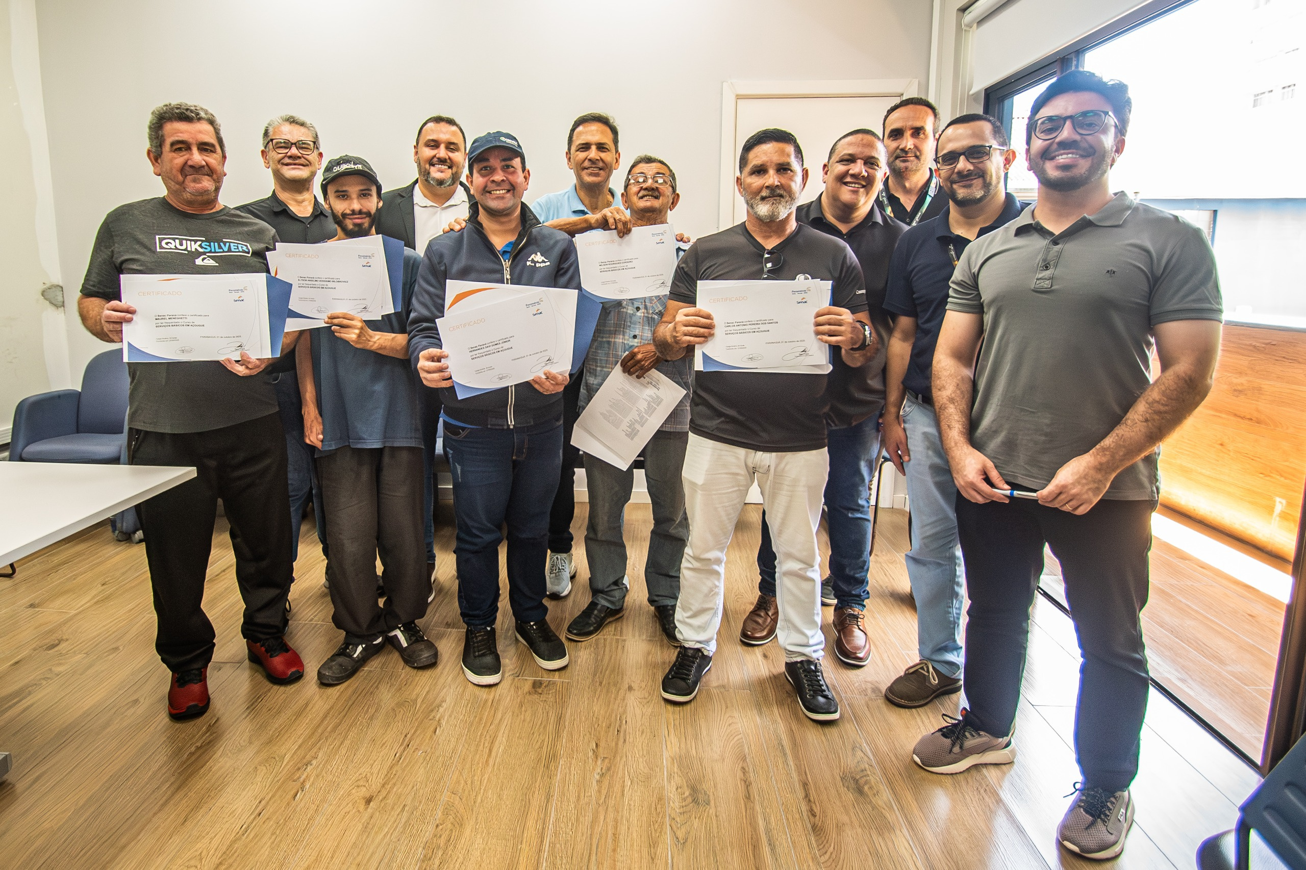 Onze novos açougueiros profissionais capacitados pelo Senac (Serviço Nacional de Aprendizagem Comercial) receberam seus certificados de conclusão de curso na sala de anexos do gabinete da Prefeitura de Paranaguá, em cerimônia realizada na terça-feira, dia 14.