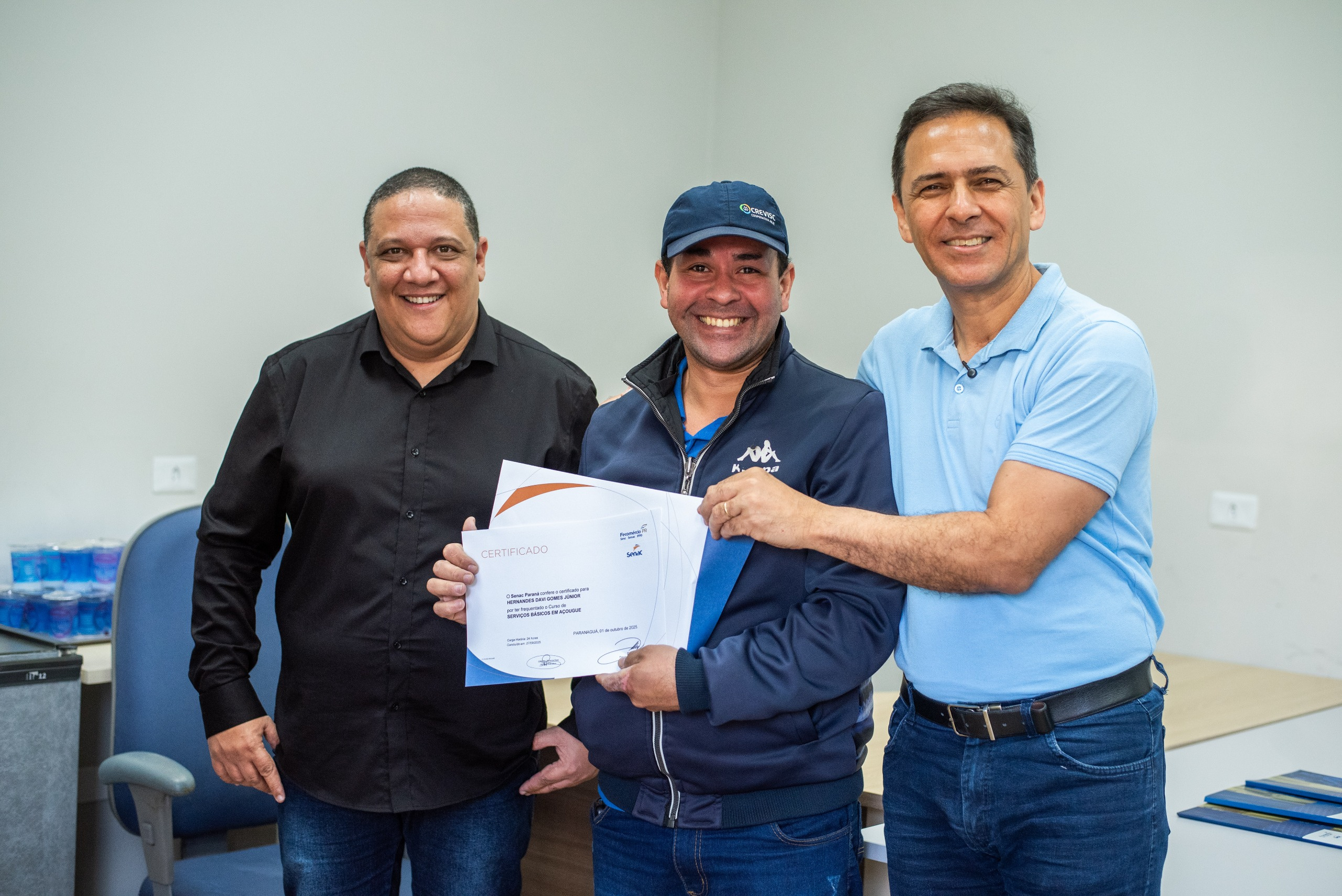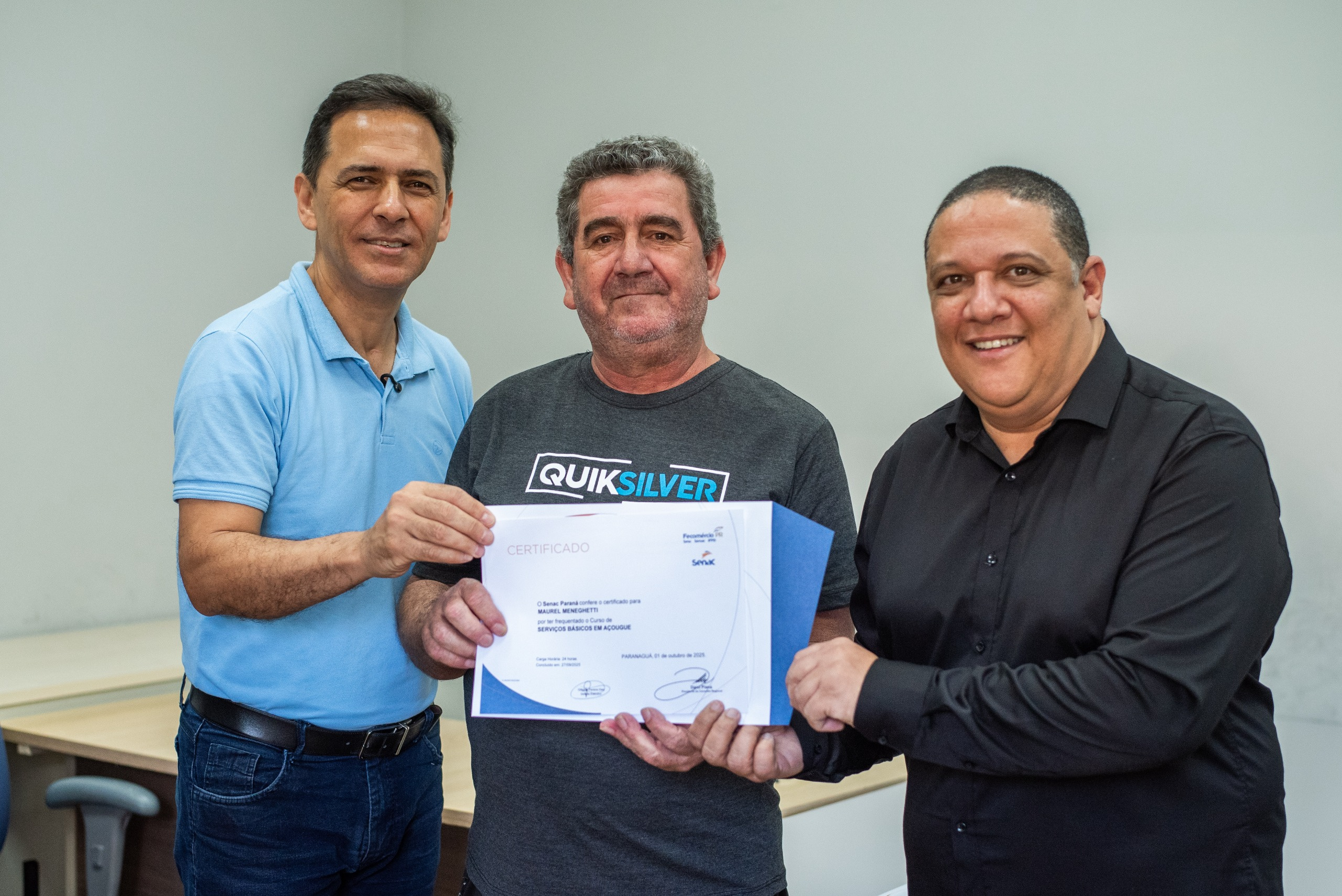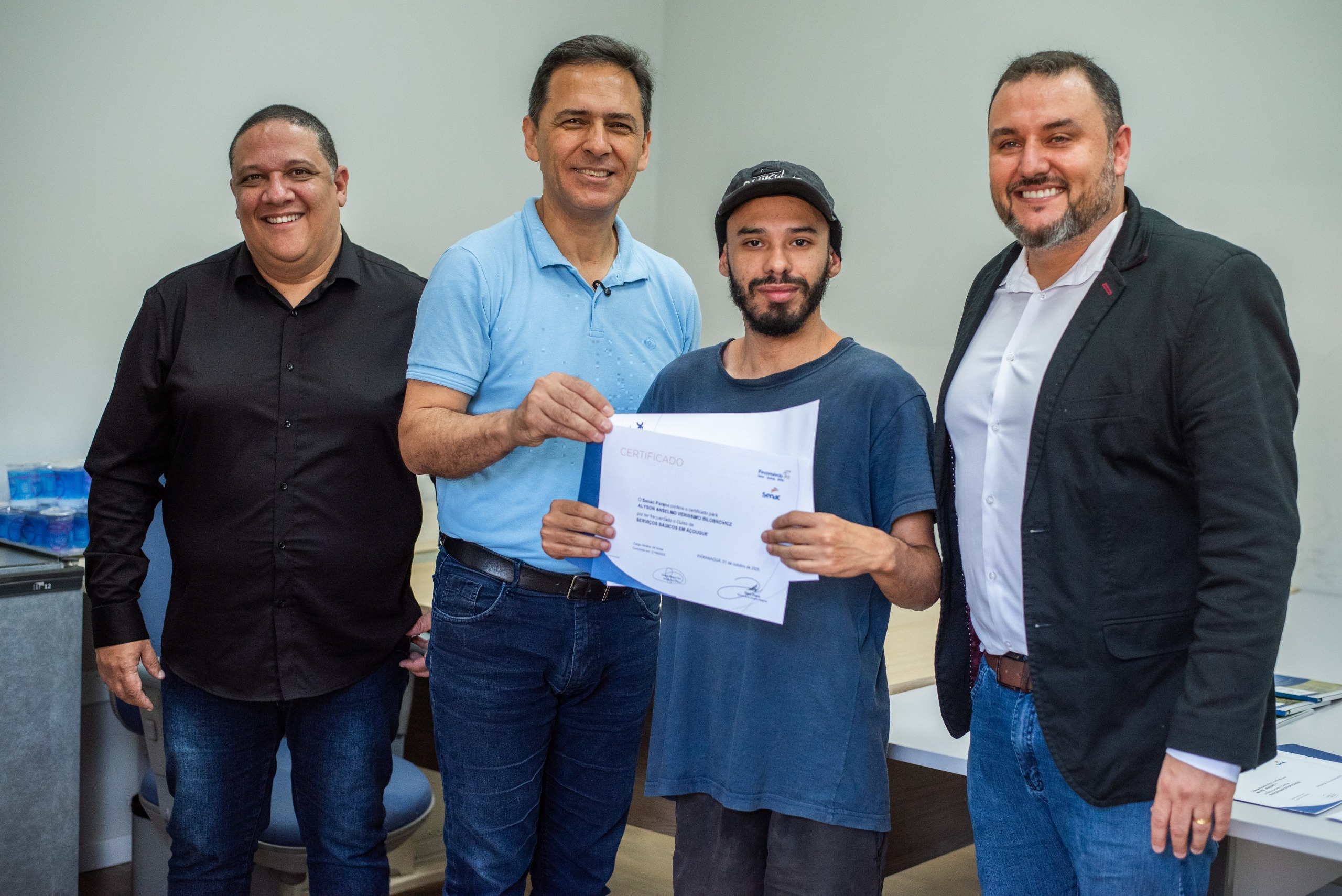 Onze novos açougueiros profissionais capacitados pelo Senac (Serviço Nacional de Aprendizagem Comercial) receberam seus certificados de conclusão de curso na sala de anexos do gabinete da Prefeitura de Paranaguá, em cerimônia realizada na terça-feira, dia 14.