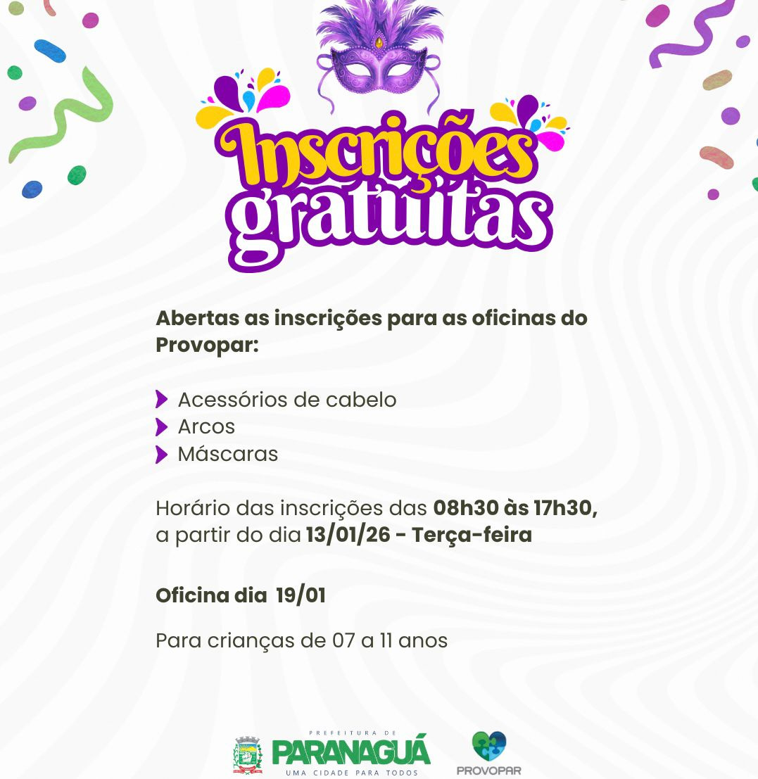 O Programa de Voluntariado Paranaense de Paranaguá (Provopar) está com inscrições abertas para a Oficina de Acessórios de Carnaval, com turmas destinadas a adultos e crianças.