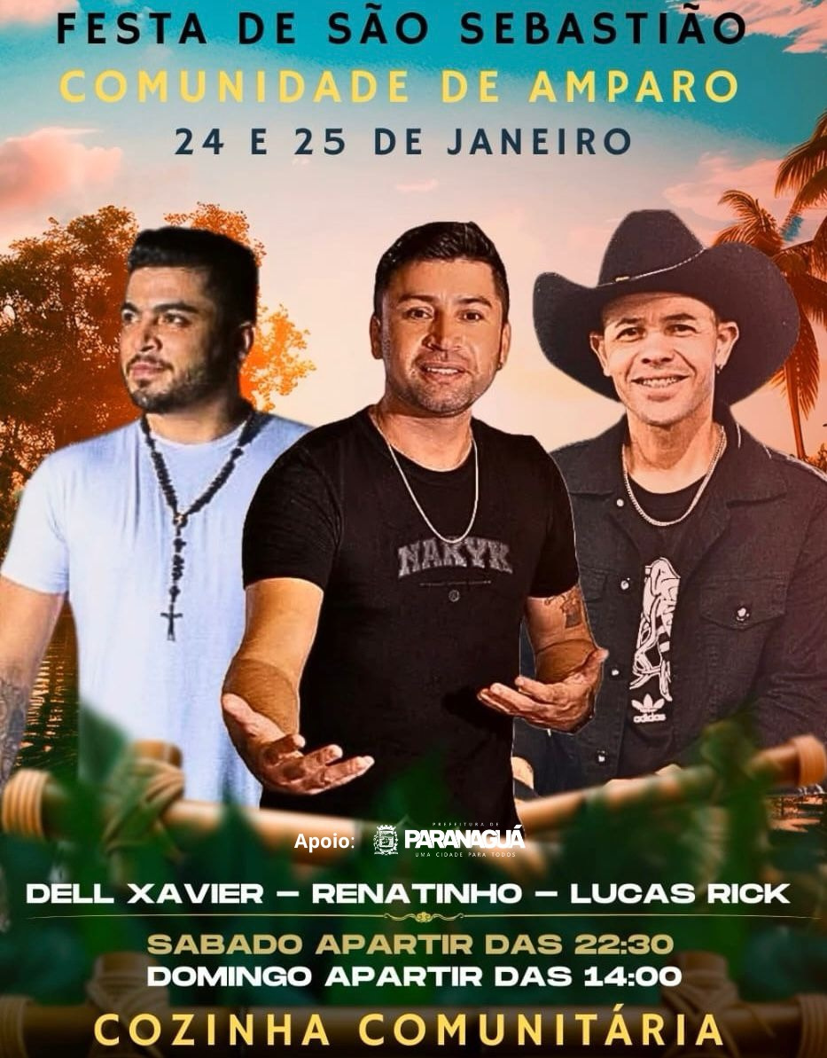 Atrações musicais: shows com Dell Xavier, Renatinho e Lucas Rick, além de artistas locais