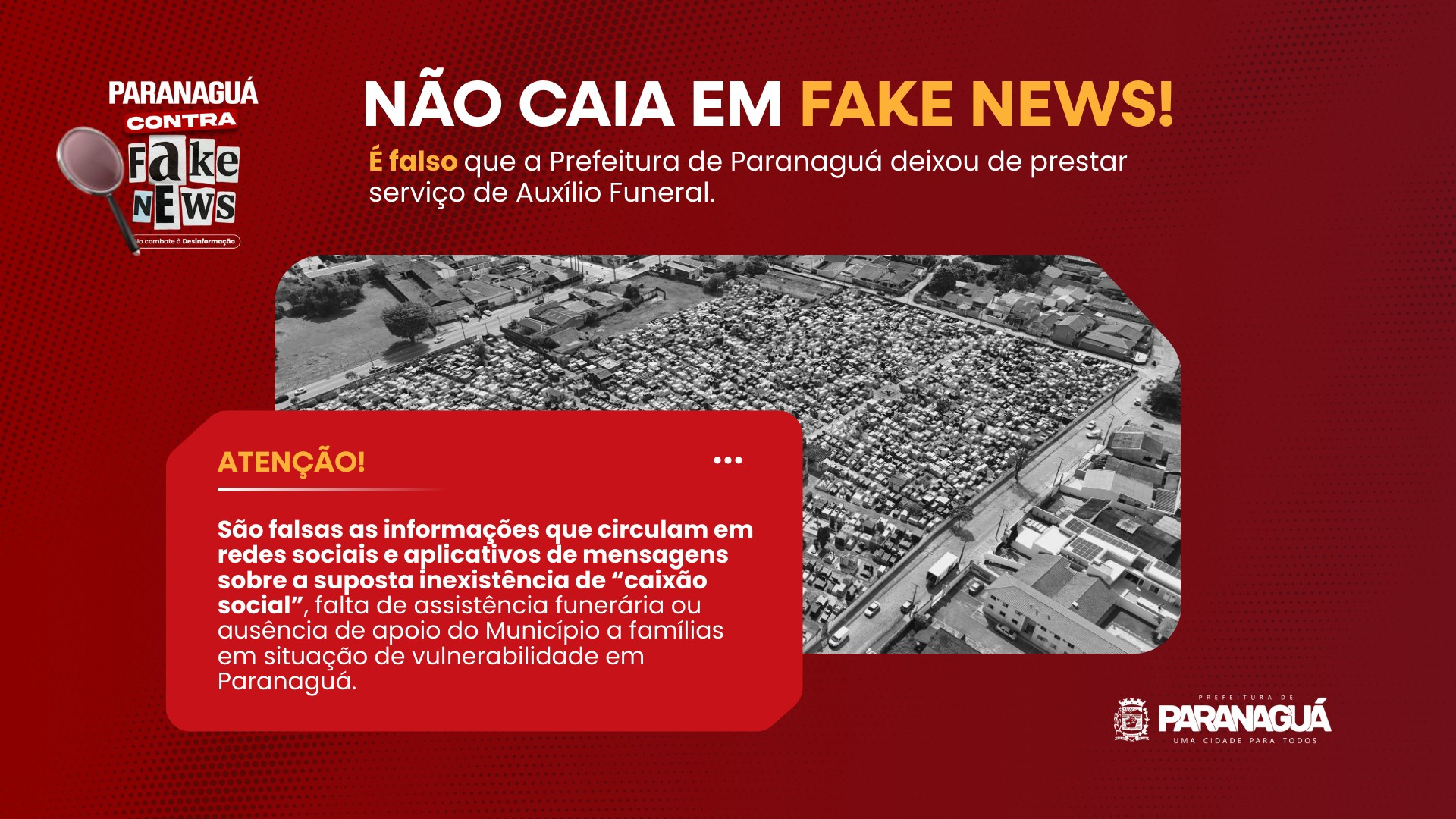 É falsa a informação que circula em redes sociais e aplicativos de mensagens sobre a suposta falta de “caixão social” e desatenção a famílias em situação de luto no município de Paranaguá.