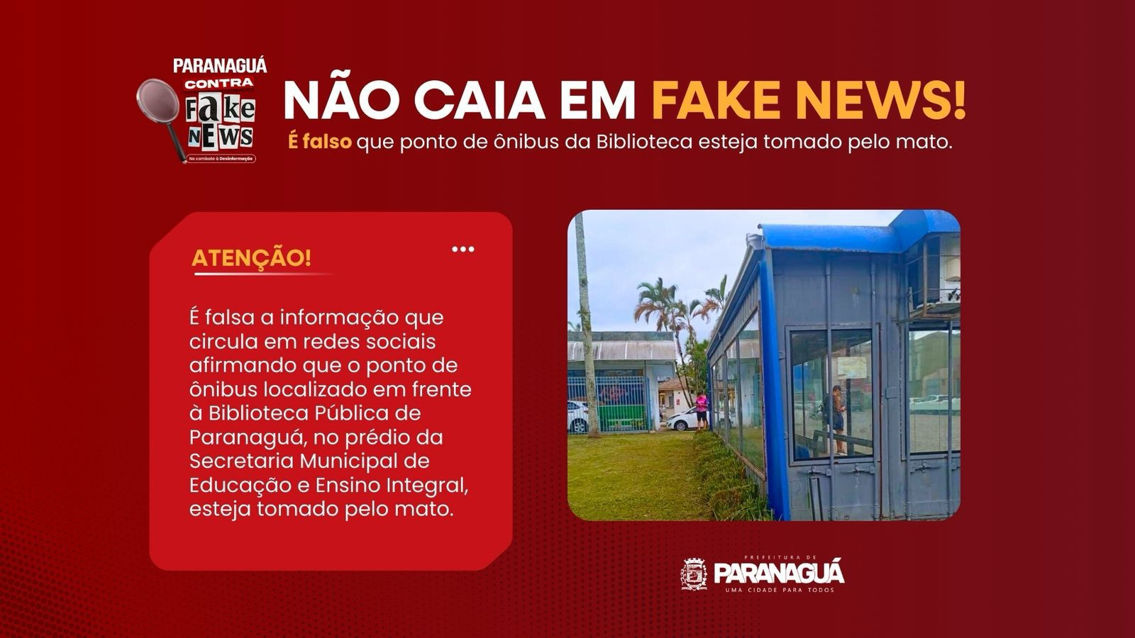 É falso que o ponto de ônibus localizado em frente à Biblioteca Pública de Paranaguá, localizada no prédio da Secretaria Municipal de Educação e Ensino Integral (Semedi) esteja tomado pelo mato.
