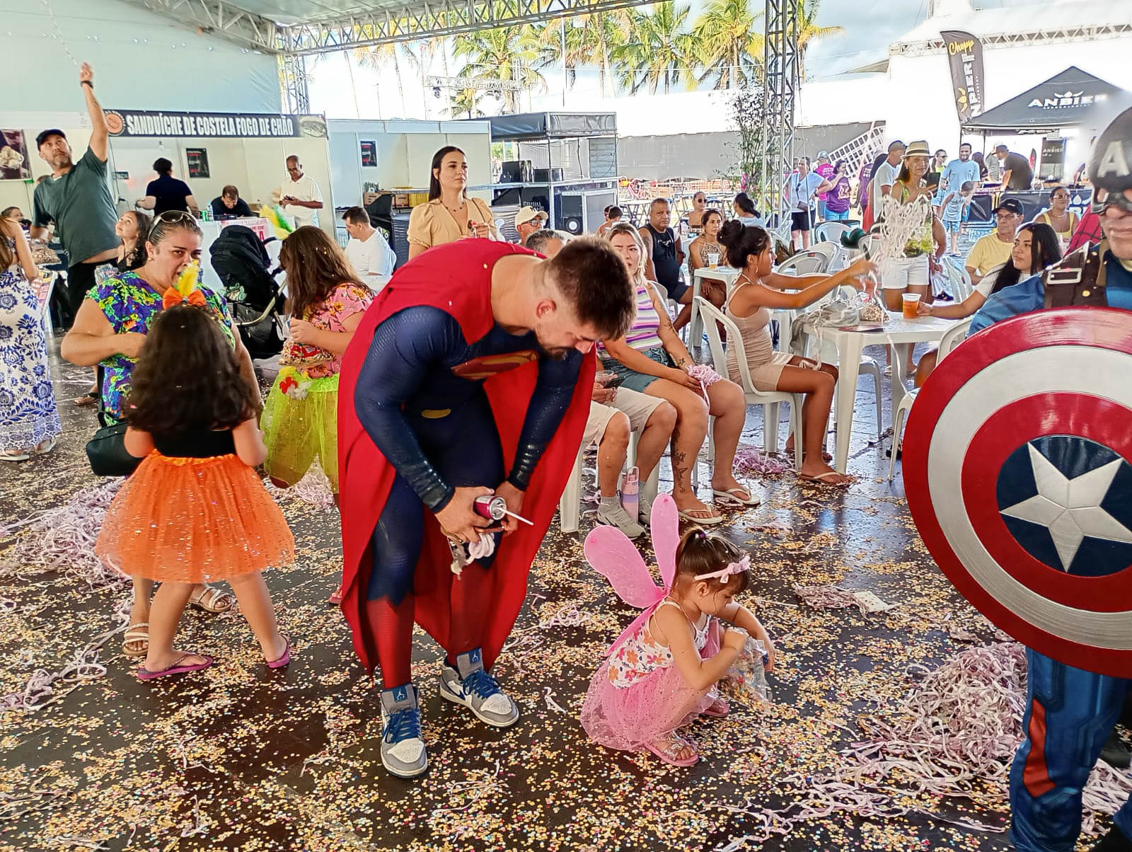 Carlos levou a filha Laura, de três anos. Ele, vestido de Superman; ela, de fada. “Eu trouxe ela pra brincar um pouquinho e fazer ela feliz, enquanto eu trabalho um pouco também, comigo ao lado”, contou Carlos.