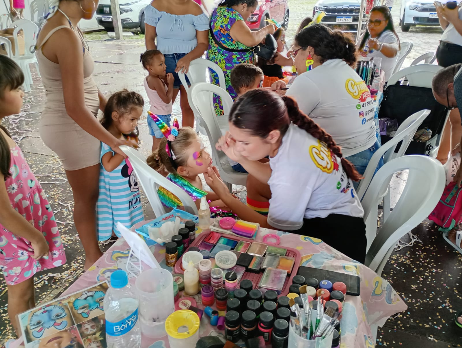 O salão se transformou em um cenário de cores vivas e fantasias, com decoração caprichada, pintura facial e personagens que passeavam entre as crianças, arrancando sorrisos a cada encontro.