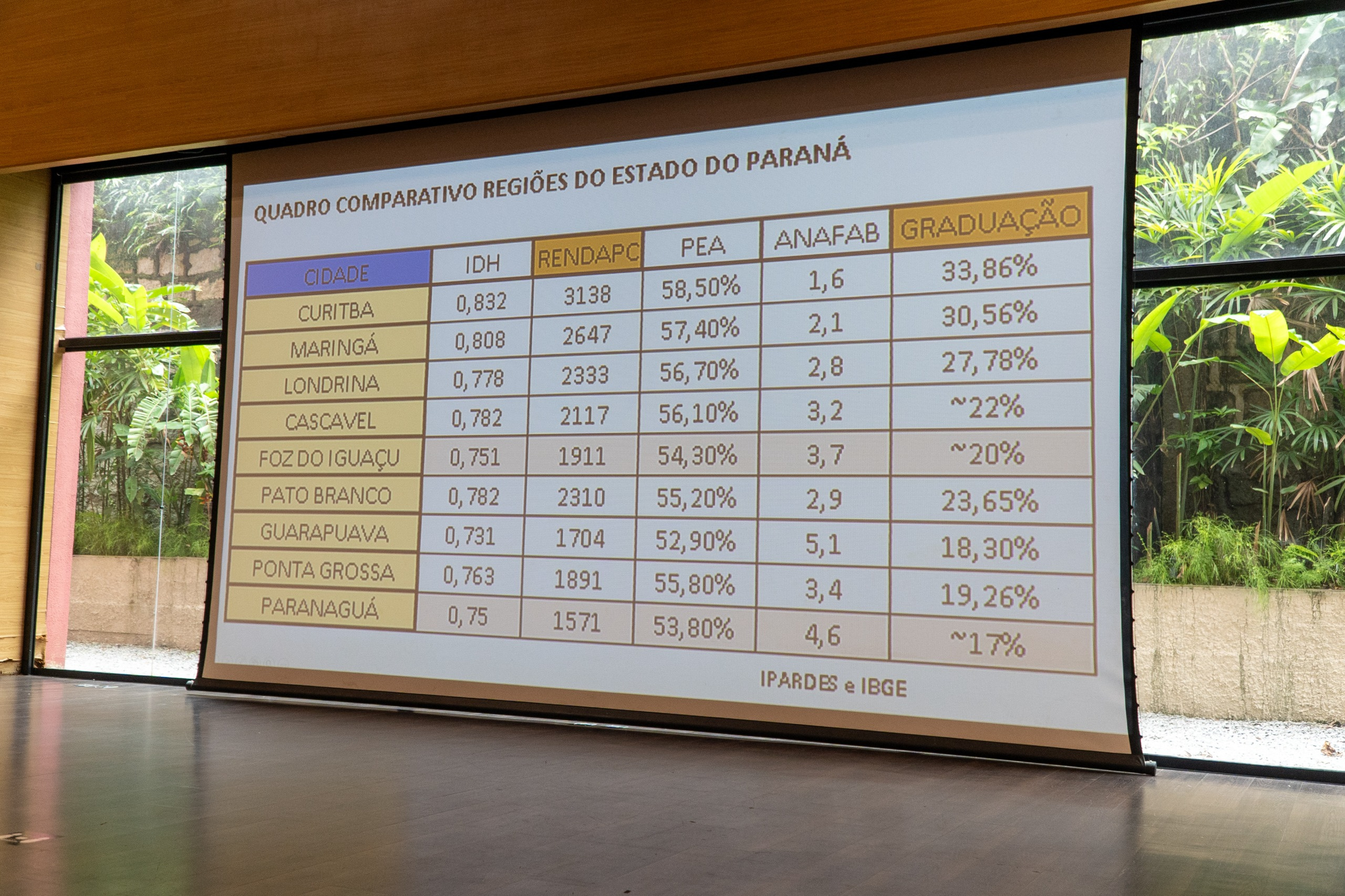 Durante o encontro, foram apresentados dados do Instituto Paranaense de Desenvolvimento Econômico e Social (Ipardes) e do Instituto Brasileiro de Geografia e Estatística (IBGE) que contextualizam o cenário socioeconômico de municípios do Paraná.