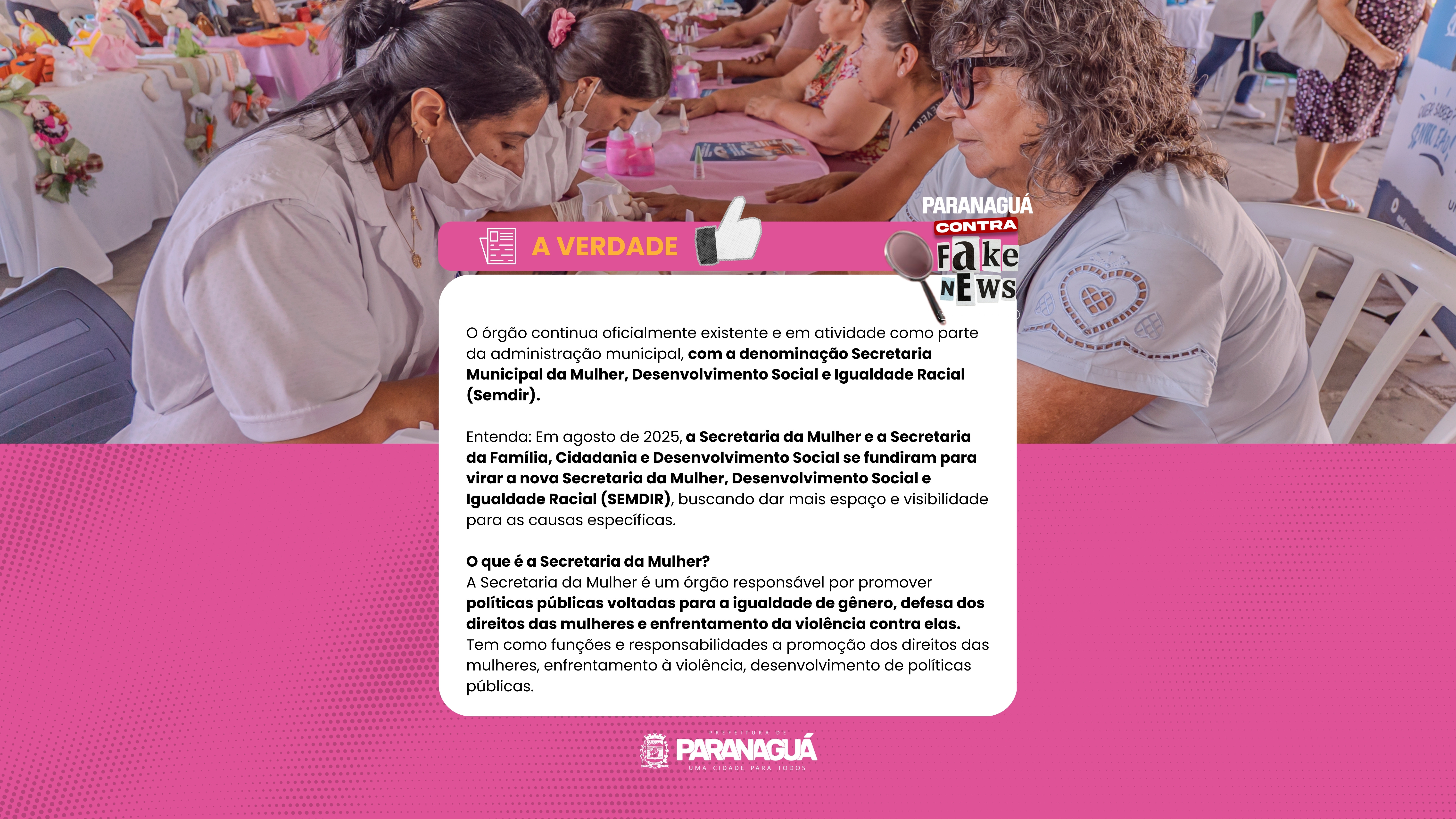 É falso que a Secretaria da Mulher de Paranaguá foi extinta