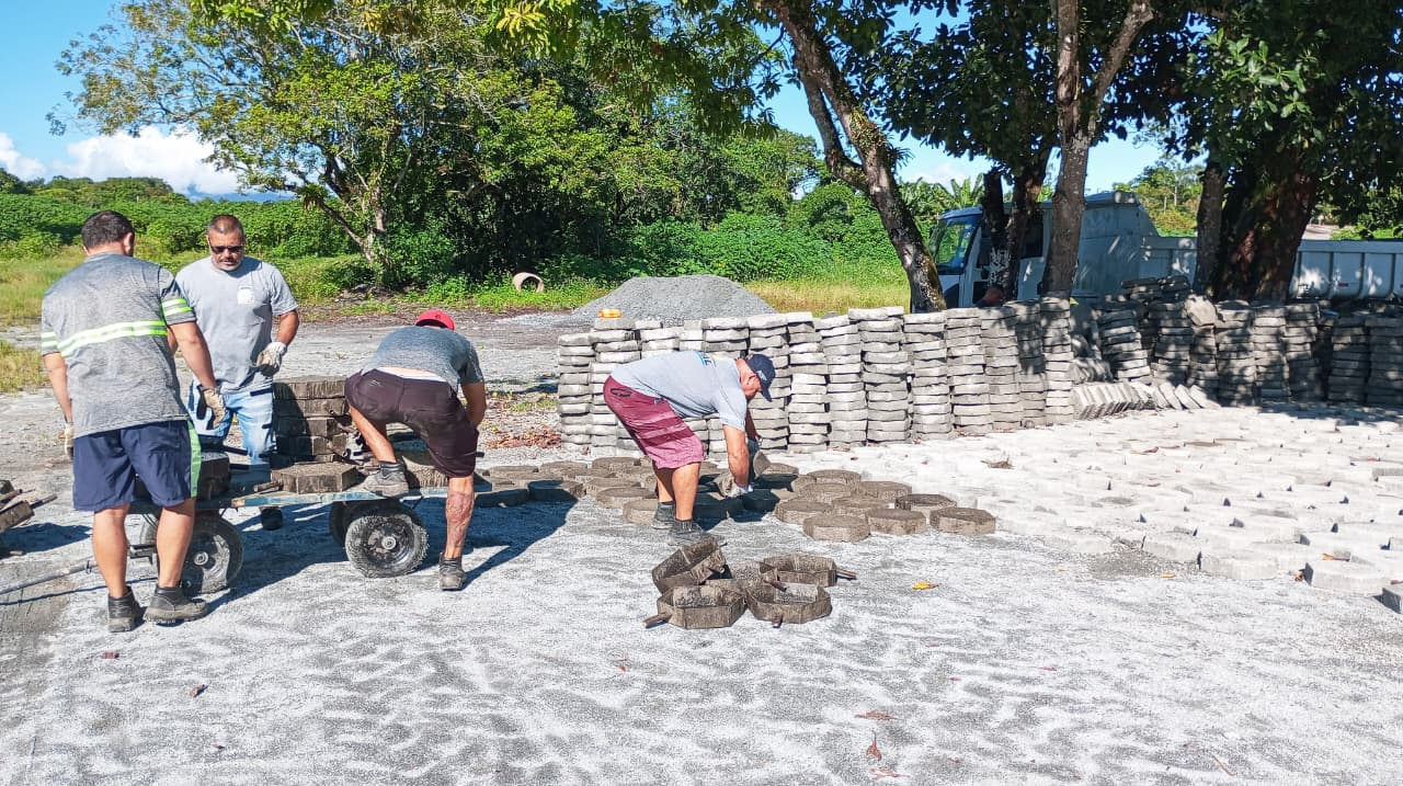 Paralelamente, as equipes seguem com a fabricação de bloquetes para atender à demanda de pavimentação em diversas vias, incluindo a própria Rua Clara Nunes e outras localidades que aguardam melhorias.