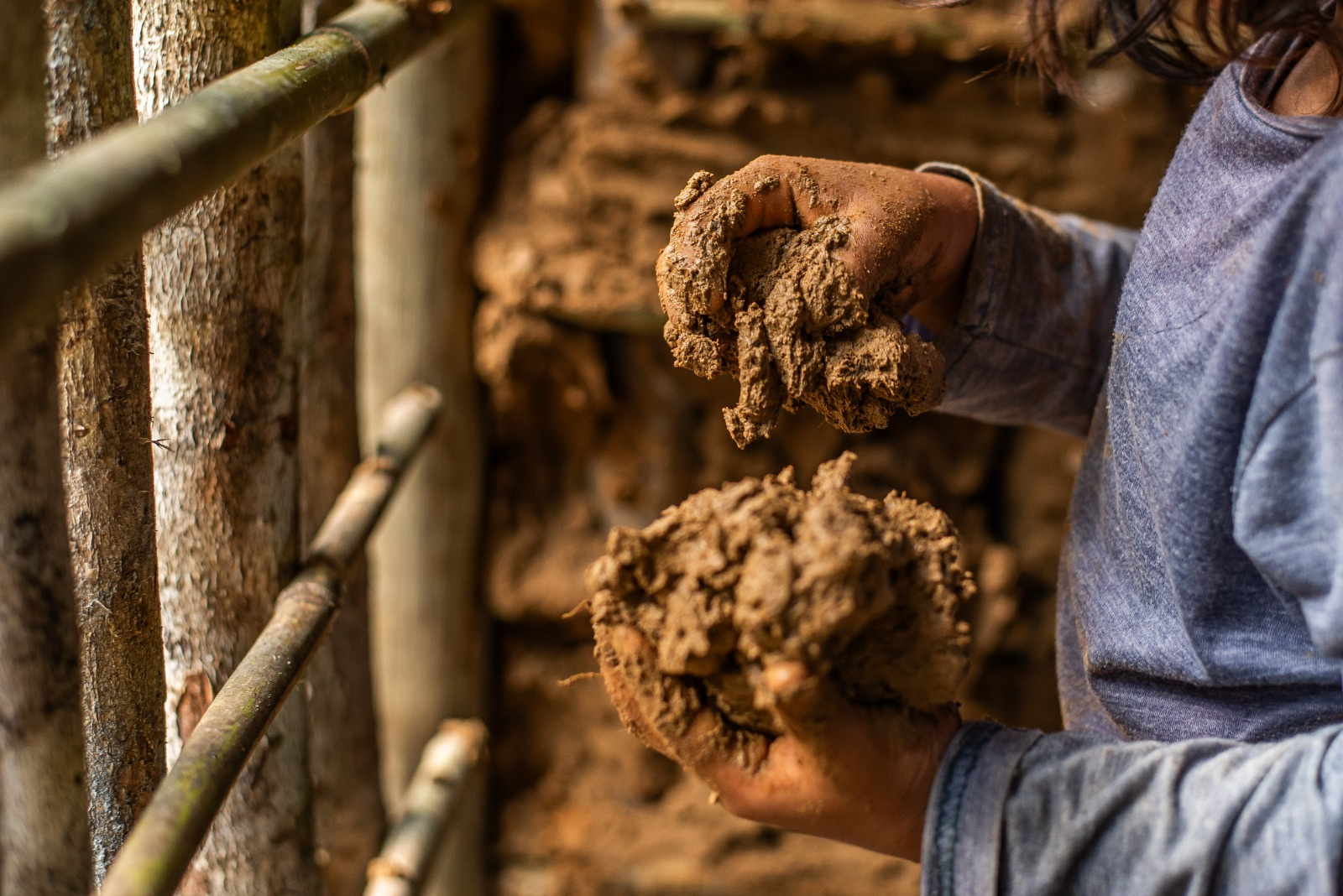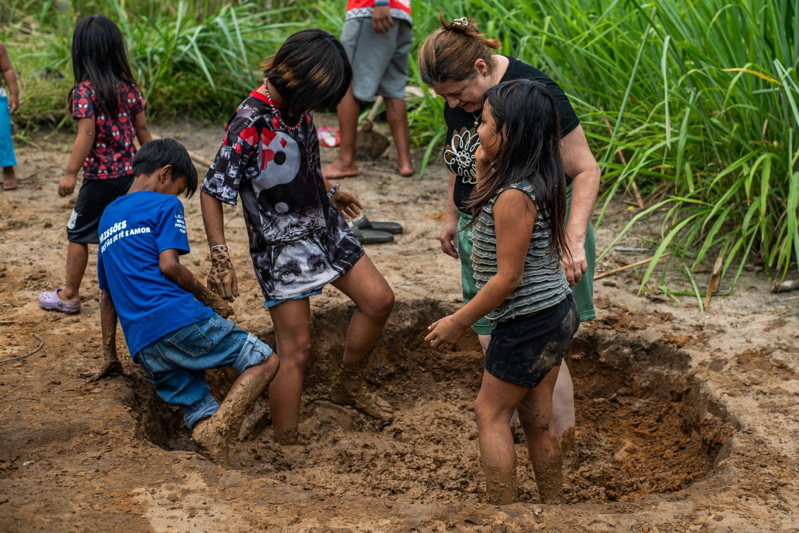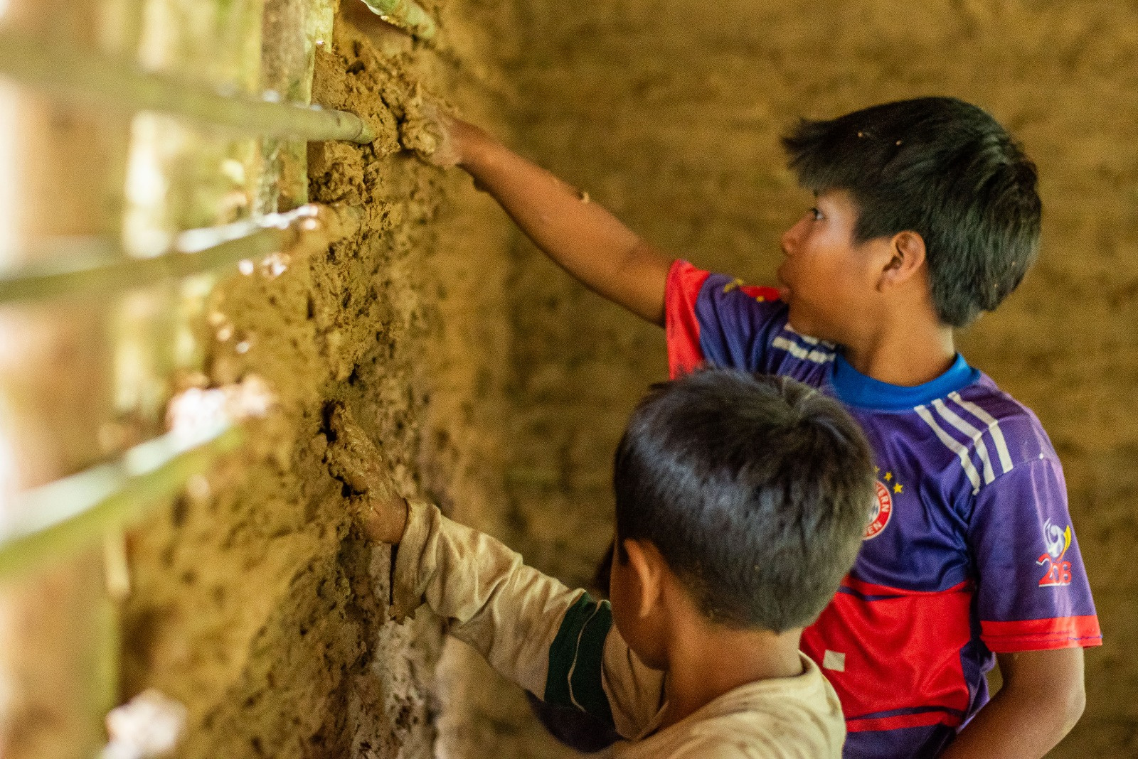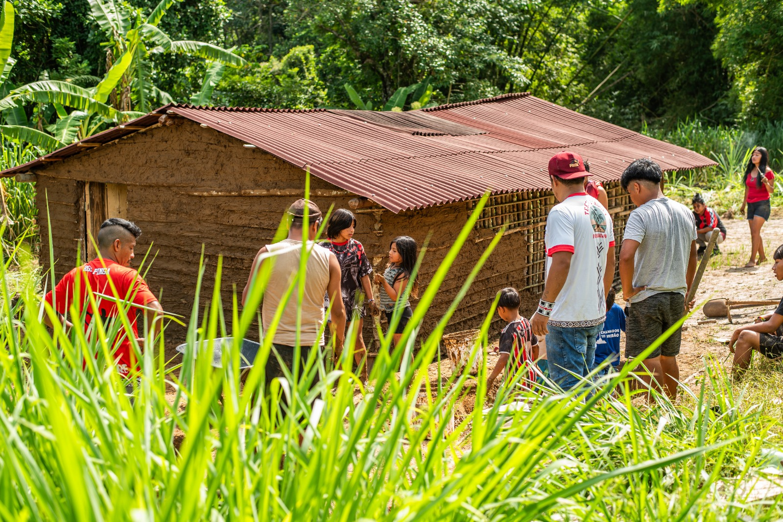 Está sendo feito um mutirão envolvendo homens, mulheres e crianças da comunidade para preparar o material que servirá para constituir as paredes da Casa. Ao mesmo tempo que as crianças se divertem, também aprendem sobre sua história e raízes.