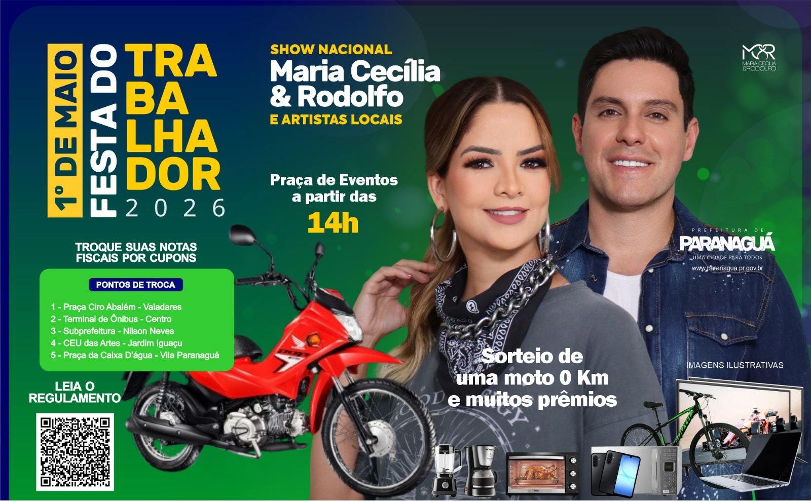 Paranaguá dedicará uma grande festa a todos os trabalhadores no dia 1° de Maio (sexta-feira). A Praça de Eventos deve receber milhares de pessoas na Festa do Trabalhador, a partir das 14 horas, com apresentações de bandas locais, sorteios de prêmios e show nacional às 22 horas com a dupla Maria Cecília & Rodolfo.