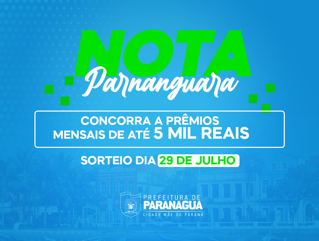Como parte das comemorações dos 373 anos de Paranaguá, a Prefeitura realiza no próximo dia 29 de julho o sorteio inaugural do programa Nota Parnanguara. O prêmio será de R$ 5 mil e todo contribuinte (pessoa física) poderá participar da promoção ao solicitar a Nota Fiscal de Serviços (NFS).